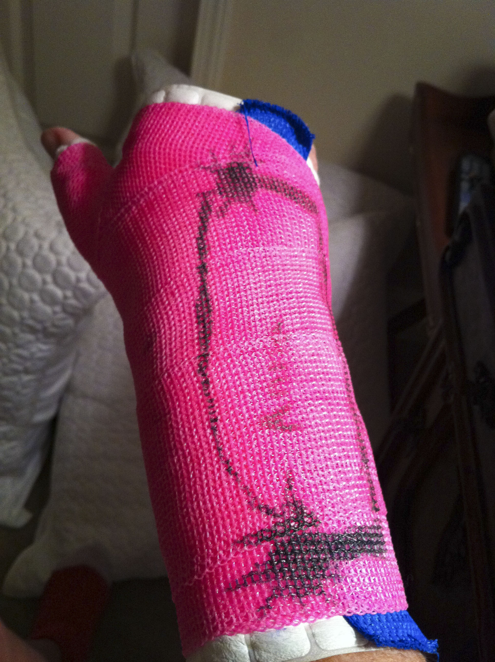 I left with a neon pink cast up to my elbow.