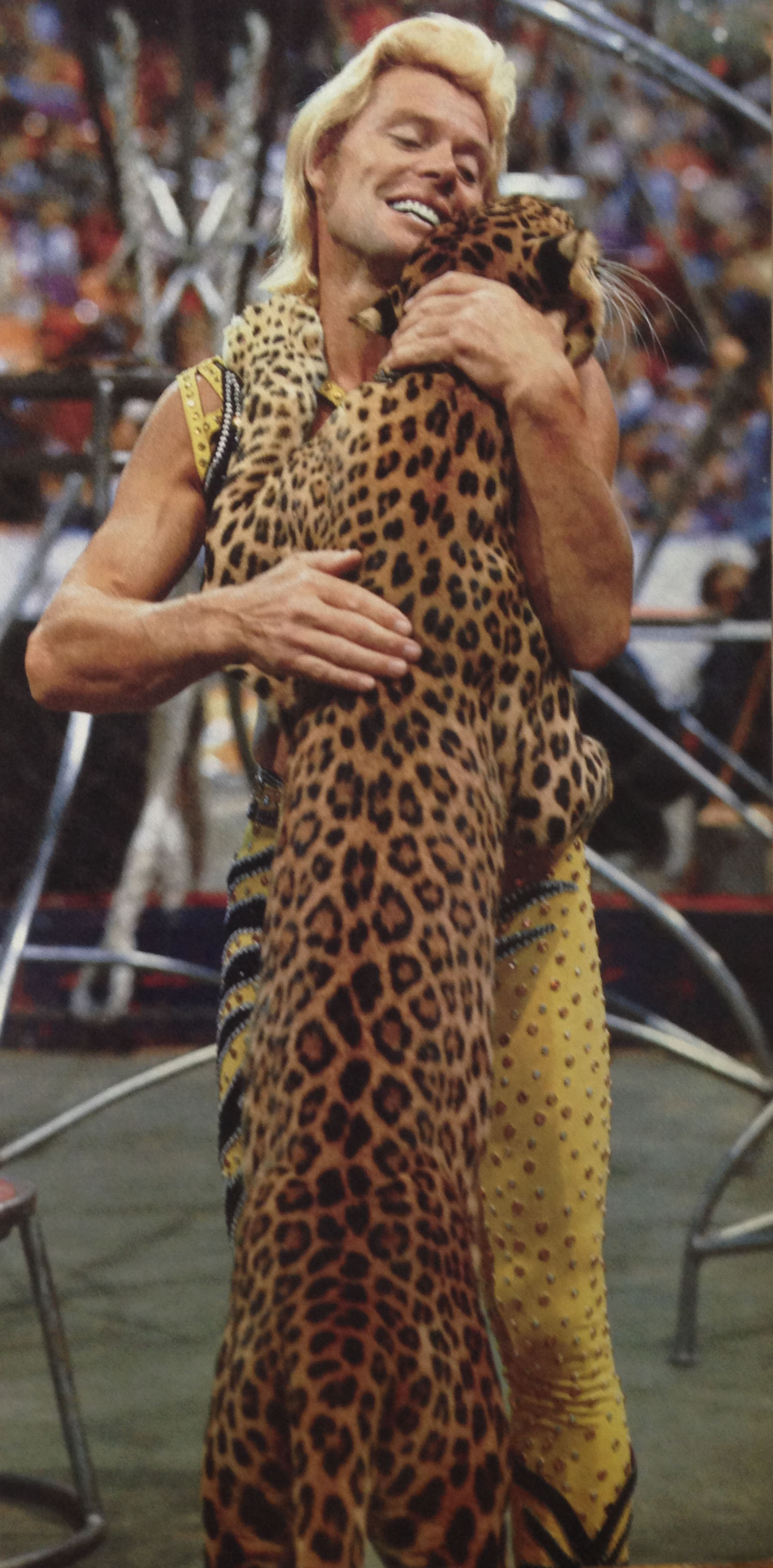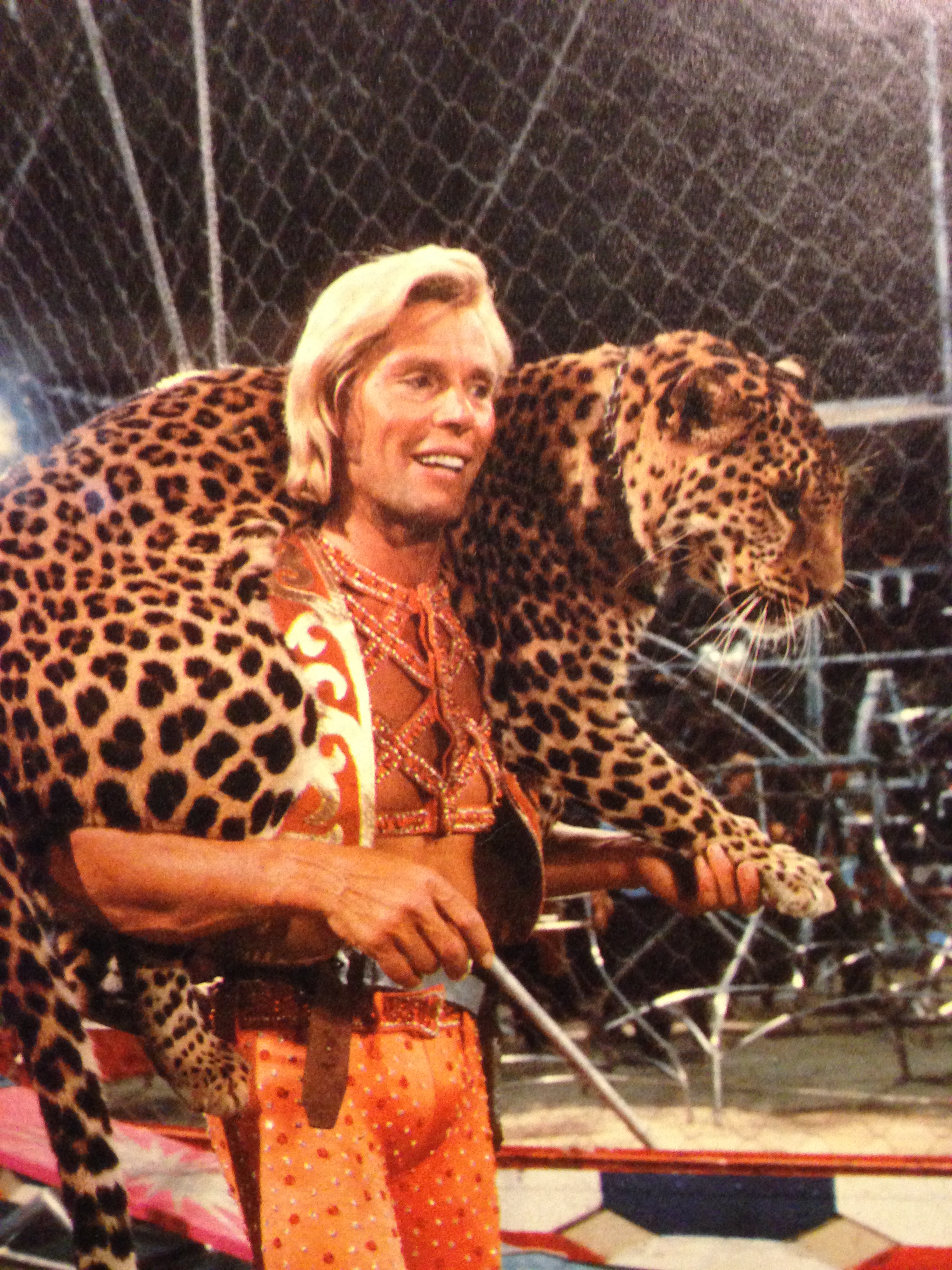 Gunther quickly played it off by doing an animated jog to the edge of the cage where crew men were always standing by. ย He stretchedย his bloody arm through one of the holes and they wrapped it in gauze like a pit crew changing a tire. ย One minute later he was back in the center of the ring setting up the next trick. ย The crowd roared and cheered, probably thinking it was all part of the show. Gunther finished his act with all the fanfare of every other performance even though his left arm was tucked into his rib cage.ย Not one trick was cut short or substituted. ย Even the final leopard embrace and giant kiss were included.