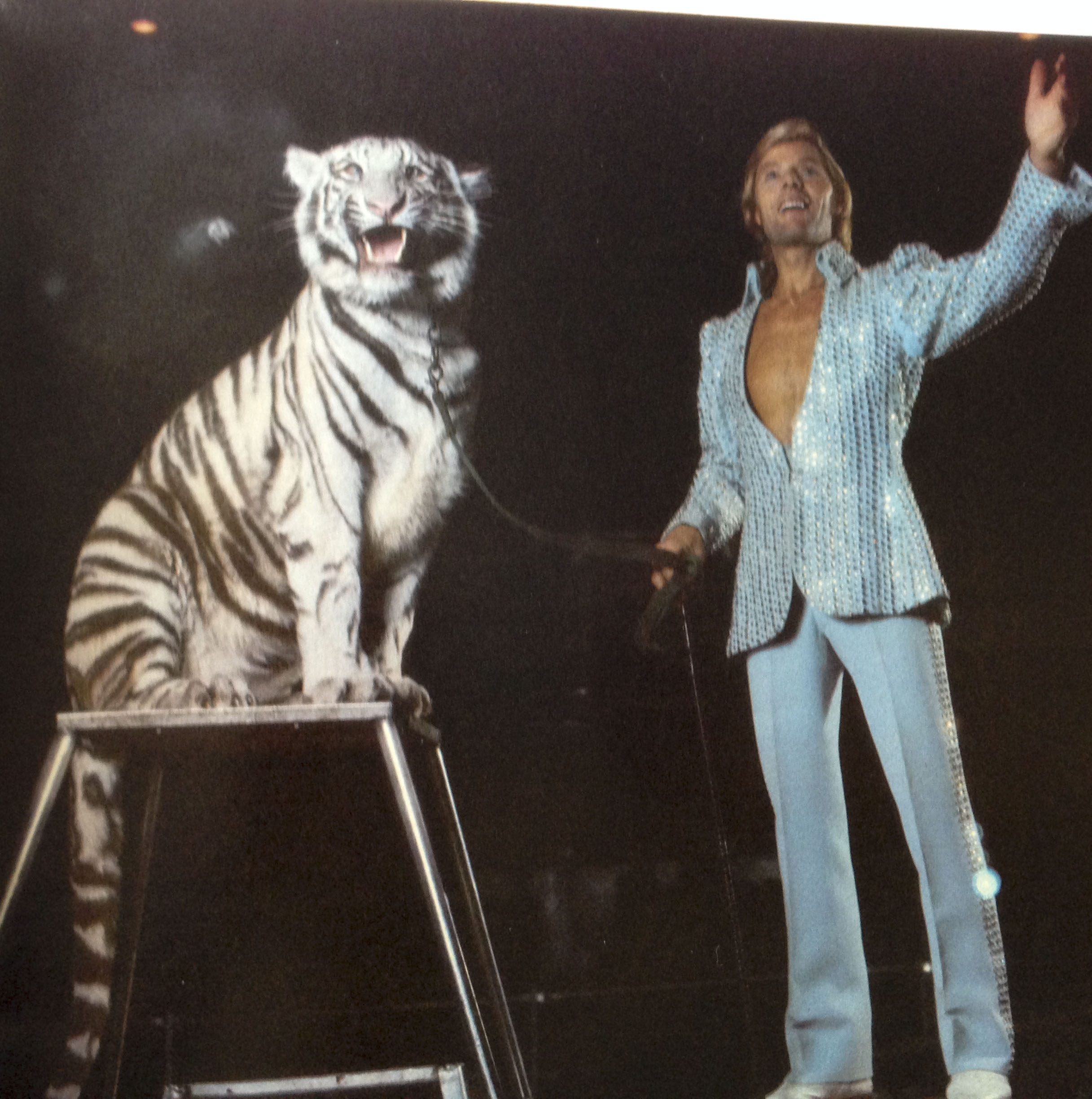 I’ve never been a fan of animals in captivity but Gunther took excellent care of his. He was the first one there in the morning and the last one to leave. ย When he wasn’t in the arena with them, he was in jeans and boots with the rest of his handlers grooming, feeding and fostering the bond he had with each of them. ย Theyย didn’t fear him. ย Theyย respected him, and it was mutual. When they performed as requested, he always thanked them – in German, as were all his commands – and gave them treats and reassuring pats. ย When they didn’t he showed mild displeasure. ย Nothing more. ย Even when they injured him, he remained patient, loyal and dedicated. ย The way a good parent is with a child.