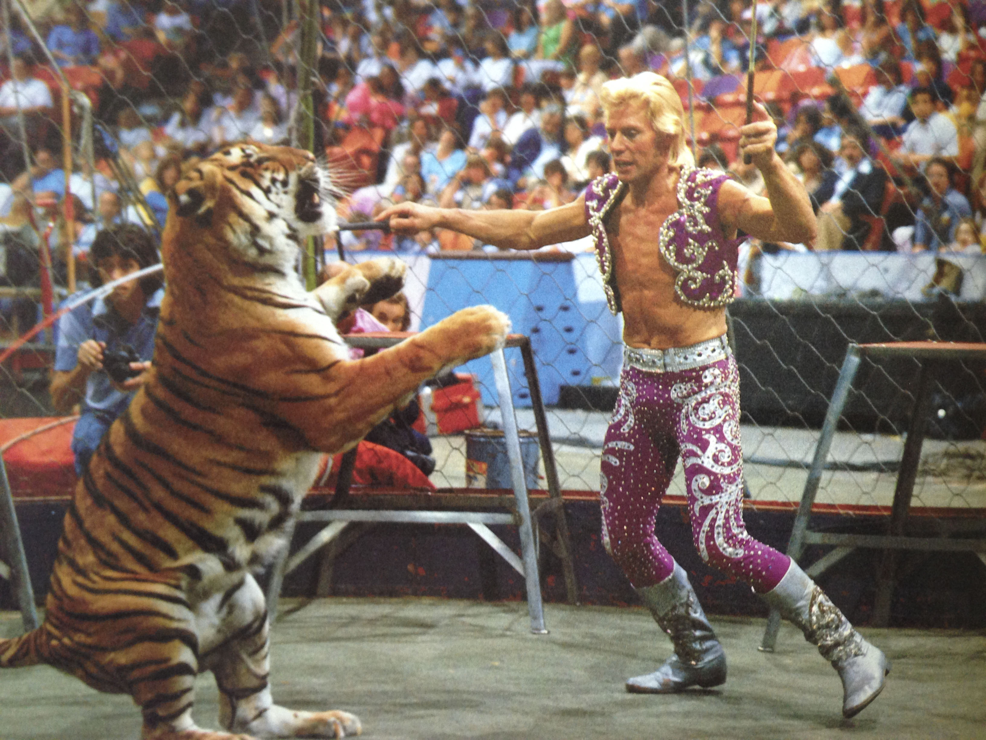 Every spotlight was onย Gunther Gebel-Williamsย when theย tiger lunged at him and took a swing. ย I was nine, and perched on my dad’s drum case watching. ย Massive claws connected on the inside of his elbow and ripped the flesh all the way down to his wrist. ย The audience gasped in unison.